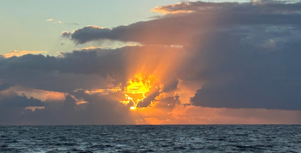 Klokken 02:00 er det min tur igjen, det er fortsatt noen små regnbyger med vindkast en gang i blant, men vinden er relativt stabil utenom vindkastene mellom 10-14 knop. Grålysningen kommer nesten umerkelig, mens himmelen endrer seg i ulike nyanser av blå, grå, rosa og oransje pastellfarger. Klokken fem kommer solen opp over horisonten i en gnistrende soloppgang.